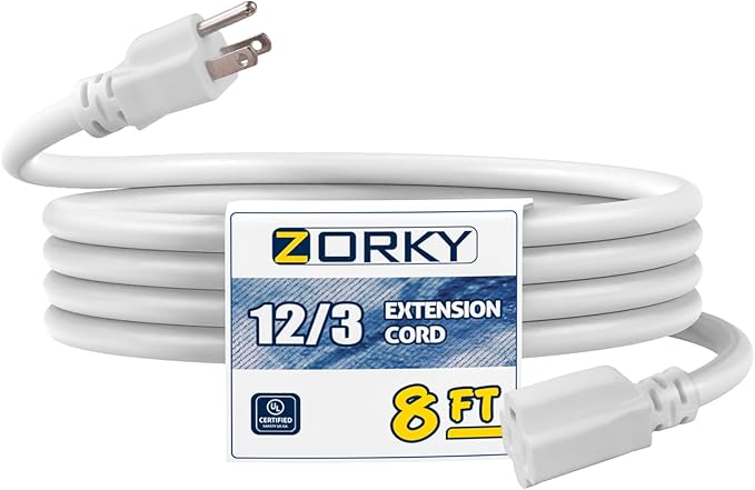 8ft Indoor Outdoor Extension Cord - 12/3 SJTW Heavy Duty Extension Cable with 3 Prong Grounded Plug for Safety -15Amp 1875W White Electric Cord Great for Garden, Appliances