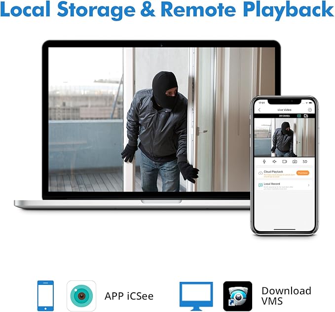 - 【 Local or Remote Access & Free APP Alerts push 】When motion is detected, our motion technology will send you alerts on your mobile devices instantly.Remotely access and play surveillance footage and control the security DVR with no contract or monthly fees with app.View and control your security system locally by connecting the system to a monitor without internet, or via free VMS Client software on tablet, PC, or via Smartphone APP (XMEye or icsee ) on mobile devices remotely.