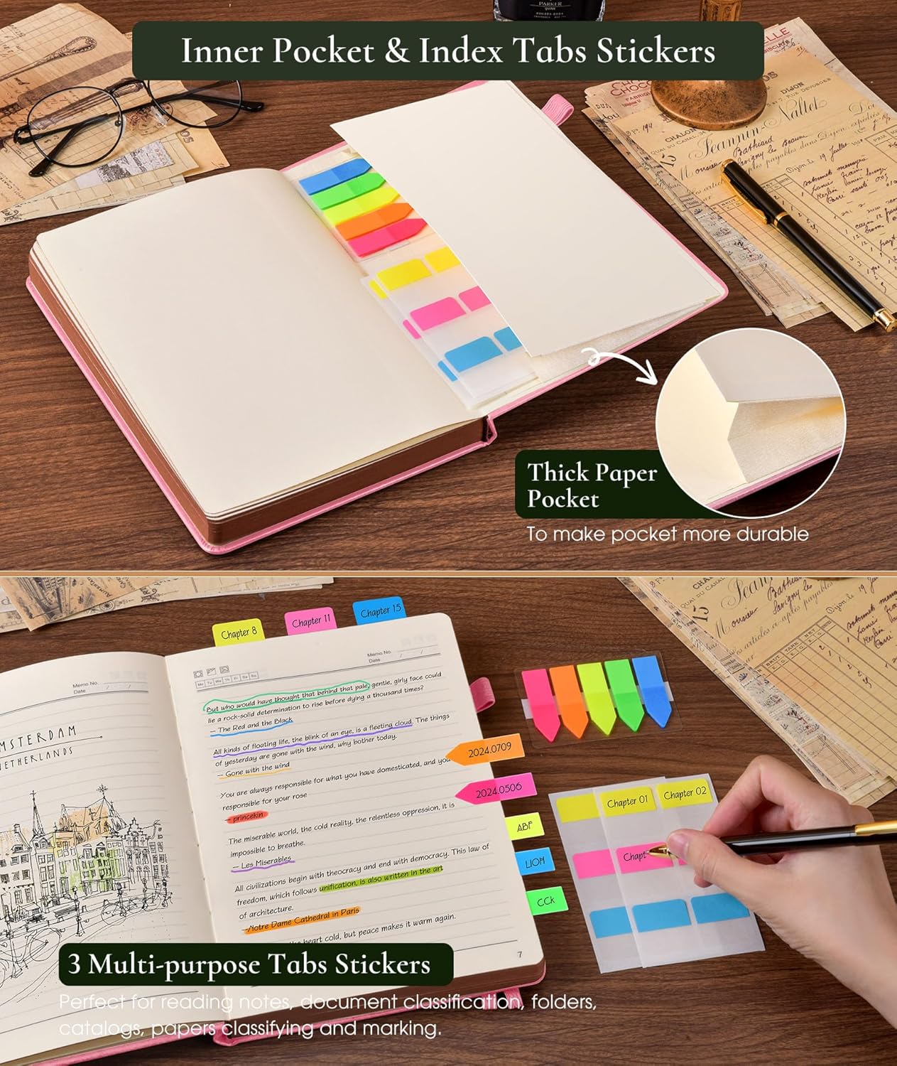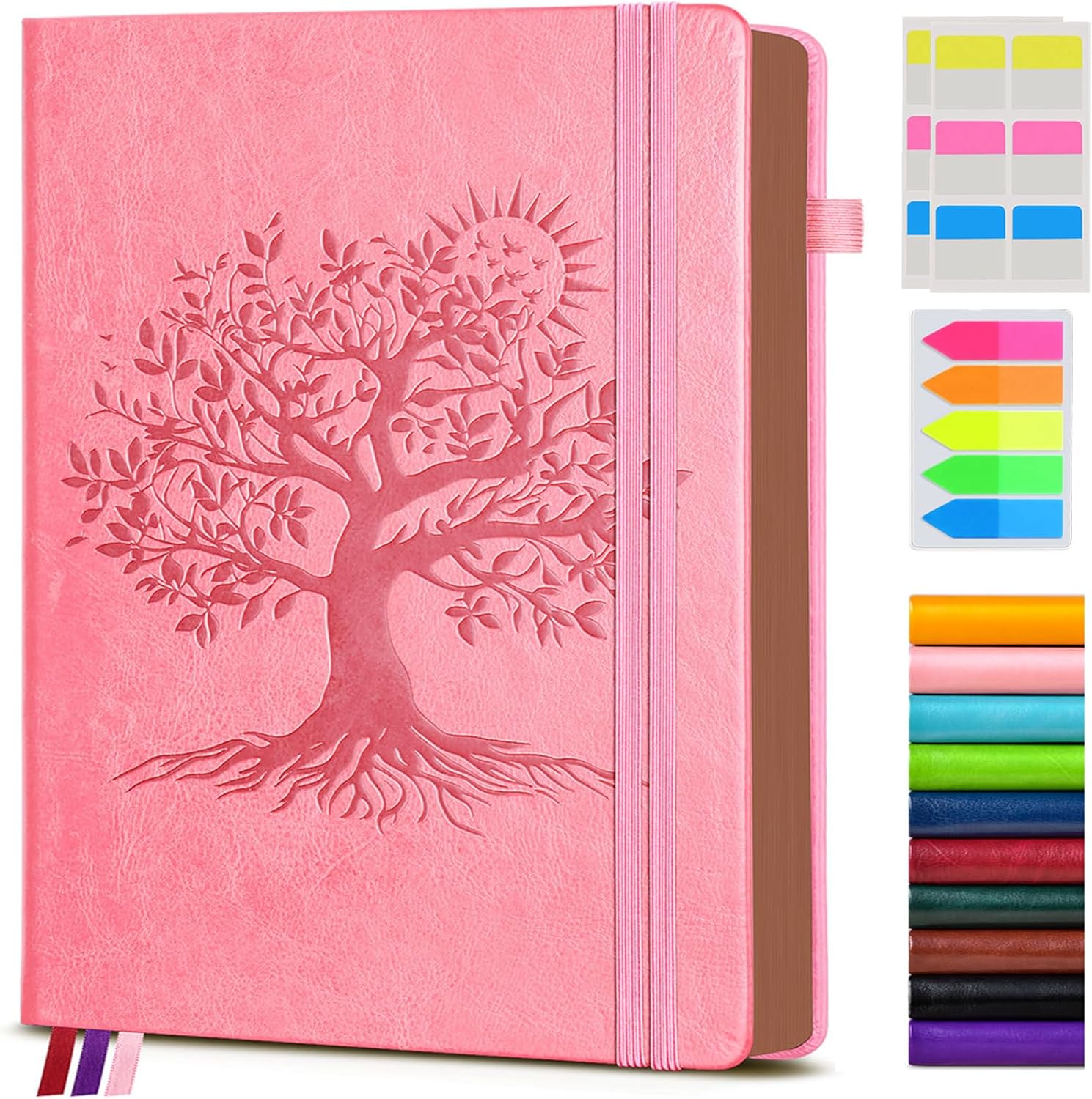 - 【BUILT-IN FEATURES FOR CONVENIENCE】This journal notebook comes with several useful features.The 1 built-in back pocket is ideal for storing loose papers or small items. The 1 elastic pen holder keeps your pen handy at all times.The 2 elastic closures ensure that the notebook stays securely closed.Additionally, the 3 colored ribbon bookmarks help you easily find your place.And the 3 free sticky tabs are great for marking important sections.