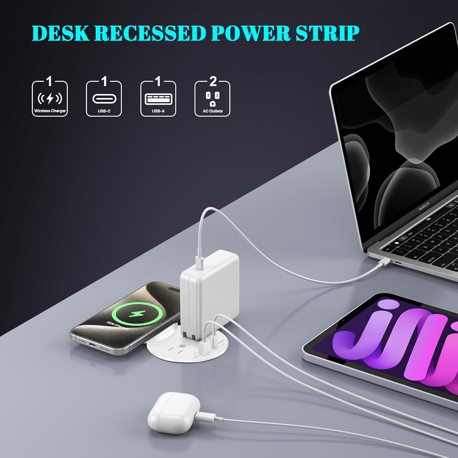 - 【Power Strip with 15W Wireless Charging】The recessed power strip is equipped with 15W wireless charger. With smart charging technology, it would charge your cellphone, pad WITHOUT a variety of converters. You can simply place your cellphone on the charger and it will be automatically stay firmly on the charger to be charged. It is also a cover which can prevent the dust. NOTE:The phone which need to support wireless charging