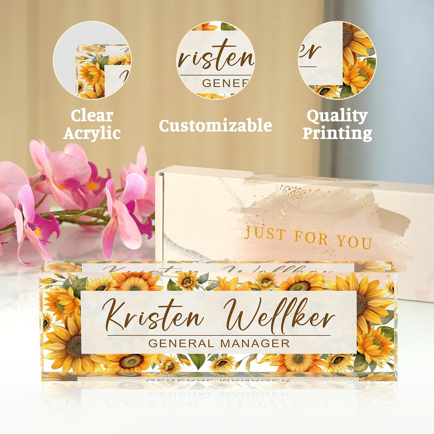- High Quality Products: This high quality name plate for desk is made of eco-friendly acrylic material, using the most professional cutting technology, the most advanced HD printing technology and the latest adhesives, which makes the product look beautiful, strong and durable, and the problem of peeling off of the pattern never exists, so please rest assured to buy our name plate for desk.