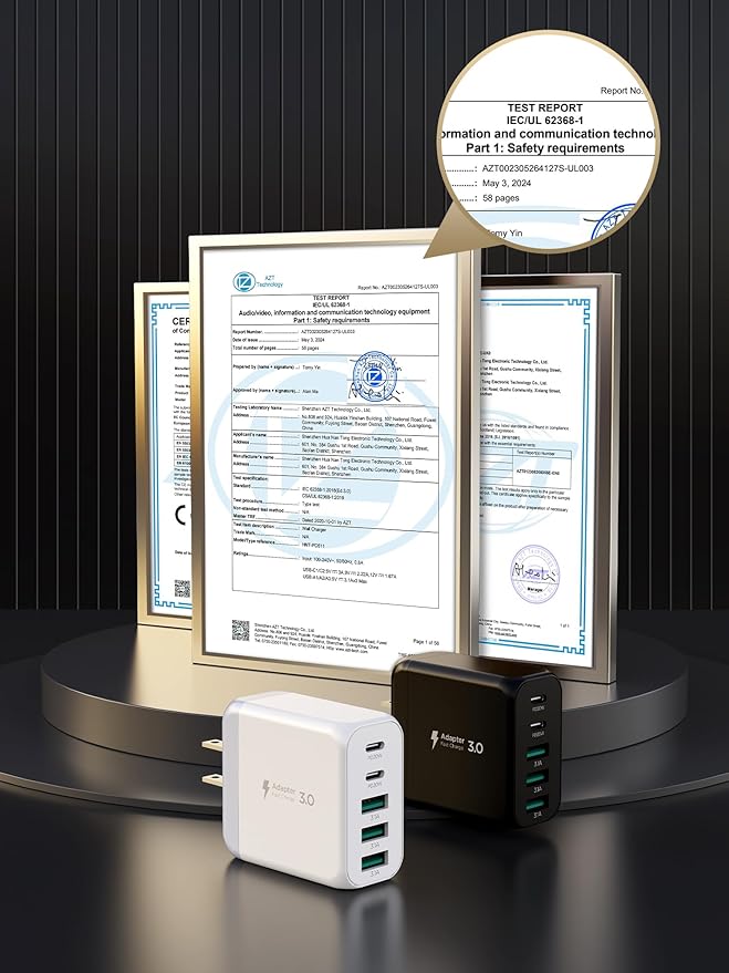 - Secure and Dependable:Certified by IEC 62368-1 TEST REPORT,FCC, this USB-C wall plug safeguards devices from overheating, overcurrents, overcharging, and short circuits. Charging stops automatically when the battery is full. Made from fireproof ABS + PC materials, it ensures safe charging for your digital devices at all times.
