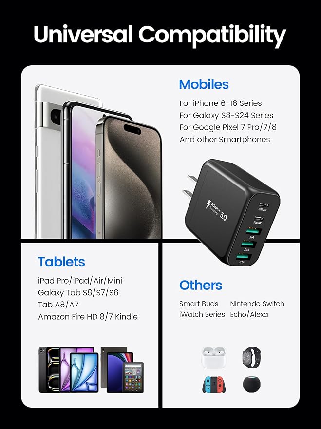 - Works with All Devices:Thanks to its special 5-port design, this USB-C charger plug is compatible with nearly all electronic devices. It works with iPhone models from 7 to the latest iPhone 17, various iPad models, Samsung Galaxy phones including the S24 and Note series, as well as LG, Motorola, Google Pixel, Apple Watch, AirPods, Samsung Watch, Galaxy Buds and many other digital devices.