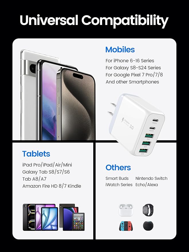 - Works with All Devices:Thanks to its special 5-port design, this USB-C charger plug is compatible with nearly all electronic devices. It works with iPhone models from 7 to the latest iPhone 17, various iPad models, Samsung Galaxy phones including the S24 and Note series, as well as LG, Motorola, Google Pixel, Apple Watch, AirPods, Samsung Watch, Galaxy Buds and many other digital devices.