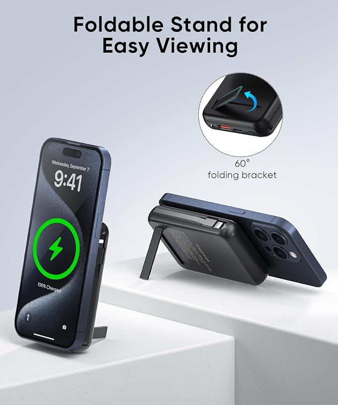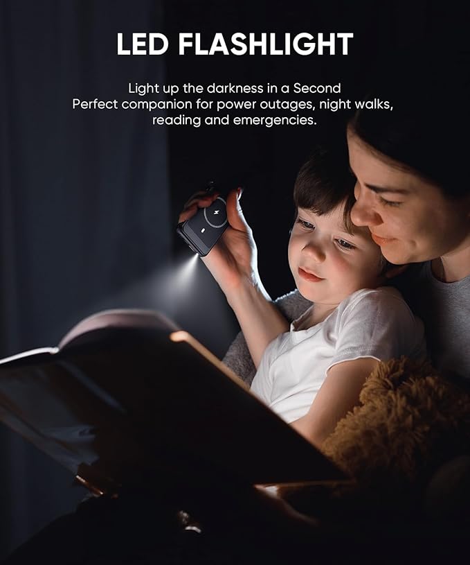 - Magnetic power bank Built-In Stand and Flashlight: Tired of holding your phone while watching movies or making video calls? Our portable iphone charger with foldable stand to support your device during use, whether you're on the road or at home. The wireless charger iphone portable is equipped with a LED torch. Perfect companion for power outages, night walks, reading and emergencies.