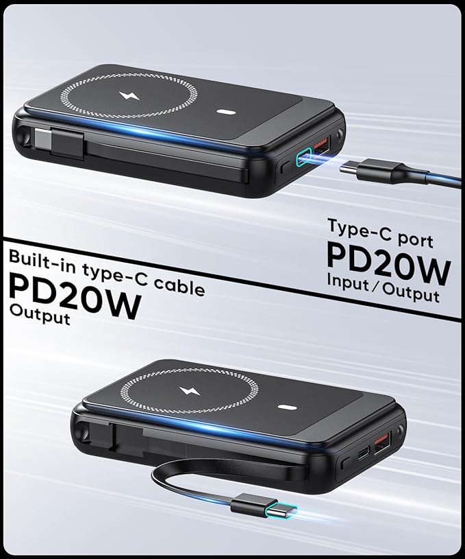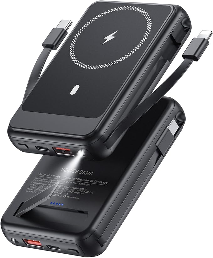 - Magnetic portable charger with 12000 mAh large capacity and power your device all day. The iphone magnetic charger portable with built in a Type c Cable and a IOS Cable, a USB C IN&OUT port, a USB A output port. Magnetic battery pack support 7.5W/10W/15W Max wireless charging, 22.5W Max USB and PD 20W Max USB C charging. The portable phone charger charges up to 5 devices max simultaneously and is compatible with most major electronic devices.