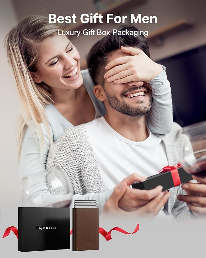 typecase Mens Wallet Card Holder: Pop Up Aluminum Case, Genuine Leather, Smart, RFID Blocking, Slim, Minimalist, Front Pocket - 9-14 Card Capacity | ID Window | Cash Slot (Black Brown)