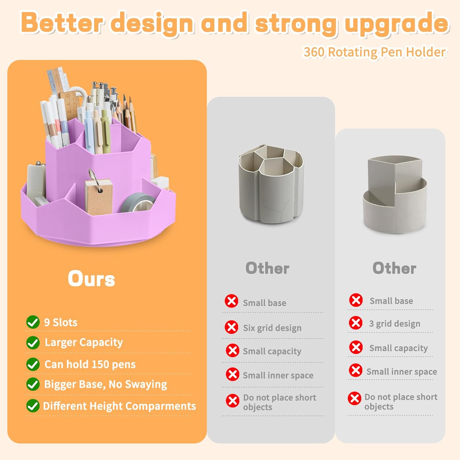 Pencil Pen Holder for Desk,9 Slots 360 Degree Rotating Desk Organizers,Desktop Storage Stationery Supplies Organizer, Cute Pencil Cup Pot For Office, School, Home(Purple)