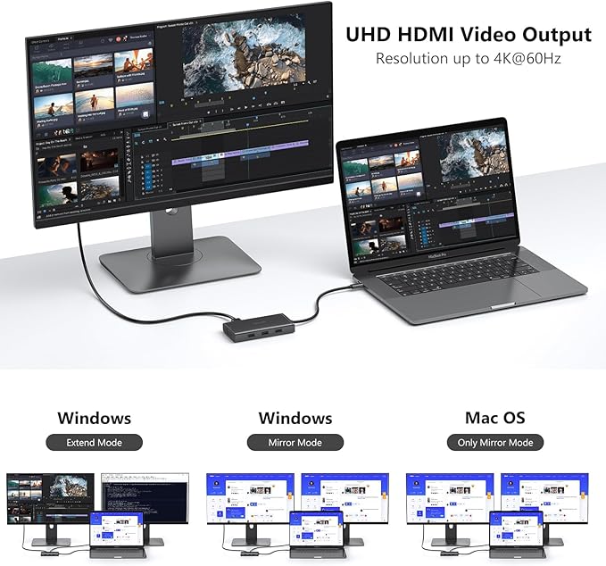 - Dual 4k Resolution Output: HDMI1/DP max up to 4K@60Hz, HDMI2 up to 4K@30Hz(work separately while source is DP1.4). When dual displays, HDMI1 or DP will be 4K@60Hz and HDMI2 up to 4K@59Hz(DP1.4). When using 2 hdmi+DP, HDMI1 up to 4K@59Hz, DP up to 4K@29Hz, HDMI2 up to 2K@60Hz(DP1.4).Display output will be 1080P when multiple monitor with VGA. Note!!! When using daul hdmi+DP, must follow the sequence or it will fail: Plug in HDMI1→Plug in DP(wait for the screen to display successfully)→Plug in HDMI2