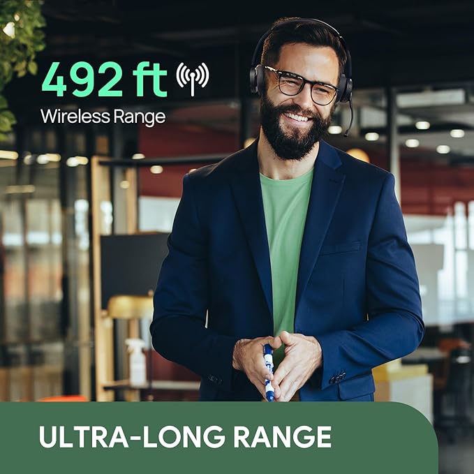 - 492 ft Longer Range: Advanced DECT tech delivers an impressive wireless range of 492 feet. DECT wireless headset have higher call security, greater anti-interference, and 2x deployment density of Bluetooth.