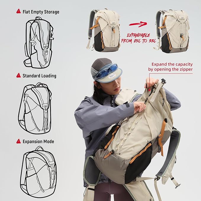 - One Backpack, Endless Adventures: Customizable compartments adapt to photography, hiking, camping, or daily commuting. Expandable design grows from 25L to 33L (or 35L to 43L), giving you the flexibility to carry everything you need—without ever switching bags.