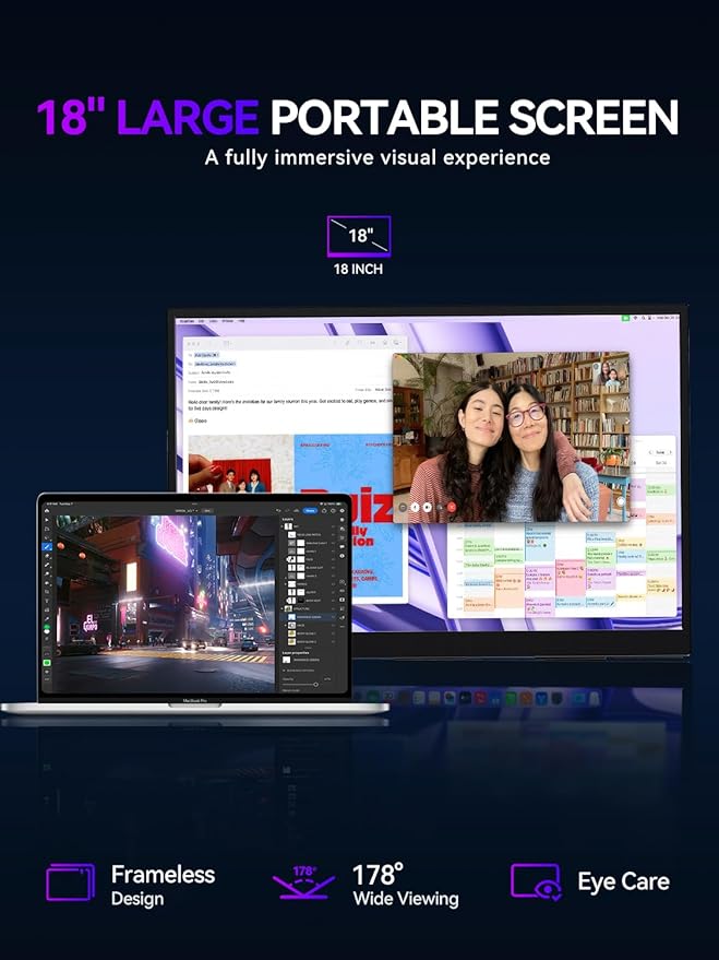 - Superb 18-Inch Portable Display: Enjoy a large 18-inch screen with a sleek, frameless design, ideal for immersive gaming and productivity while remaining highly portable