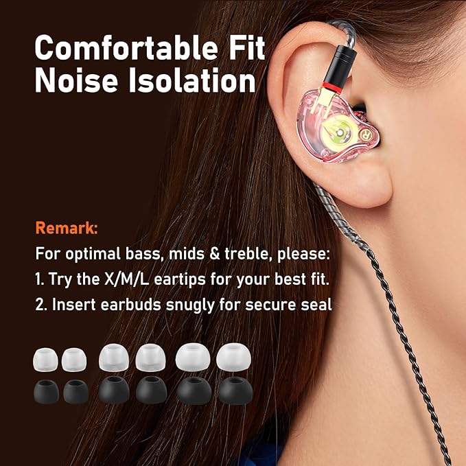 - COMFORTABLE FIT & NOISE ISOLATION - Ergonomically designed to fit the ear canal, Vibes 202M IEM headphones feature preformed over-ear earhooks for a secure fit and keep cables out of the way. With 6 pairs of soft, breathable eartips (in 2 colors and 3 sizes), they ensure optimal comfort and stability while effectively blocking ambient noise for immersive listening.