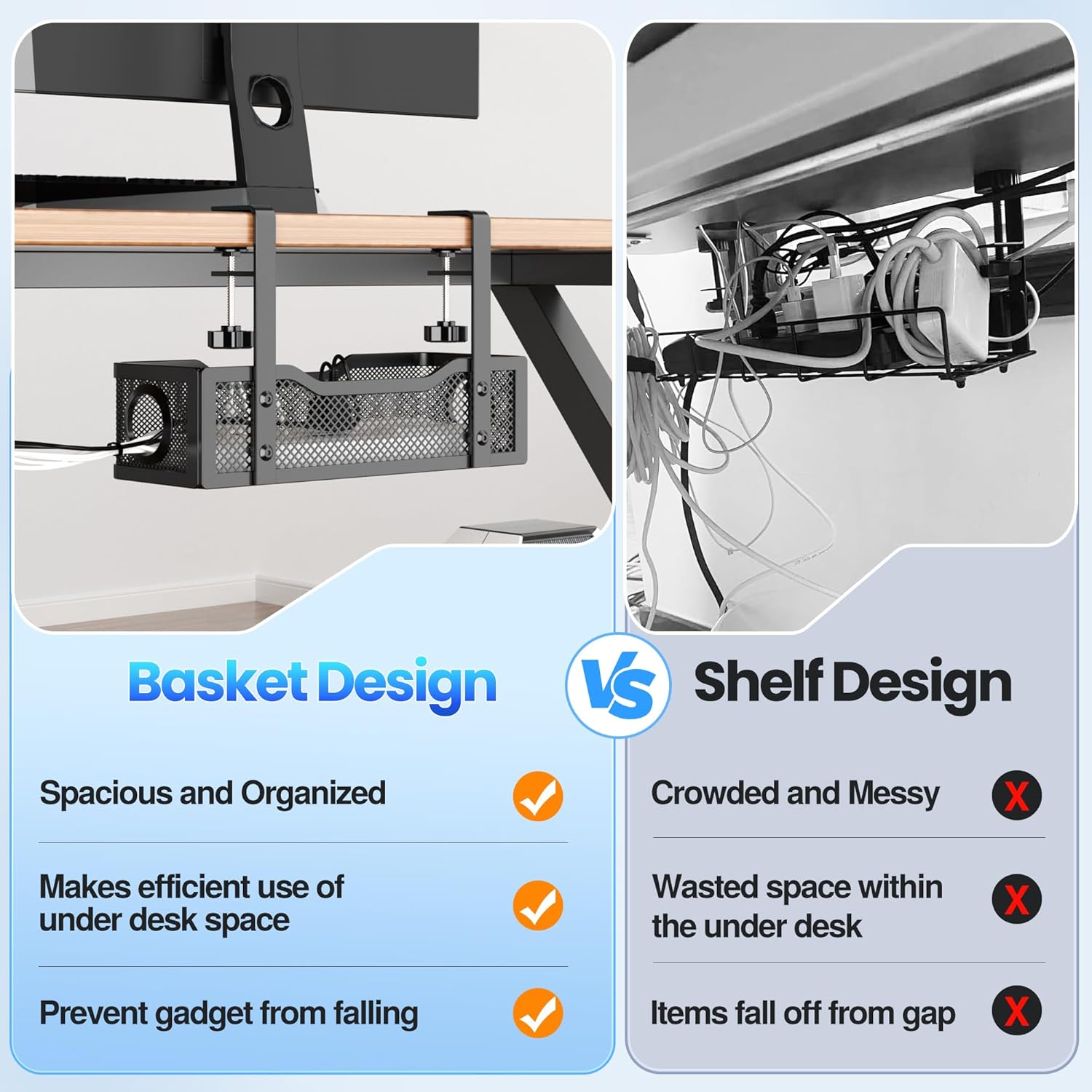 - 𝐒𝐚𝐯𝐞 𝐒𝐭𝐨𝐫𝐚𝐠𝐞 𝐒𝐩𝐚𝐜𝐞- No more mess. No more hanging or tangled wires. Giving you a total wire management under desk. Organizes any data cables, power cords, outlet strips off the floor. You can hide wires from your feet to keep your desks and floors clean and tidy.