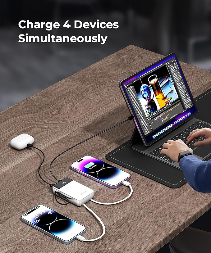 - 【Four Devices, One Charge】With 30000mAh capacity, our banks can offer 5.5 charges for the iPhone 15, 4.6 charges for the Samsung S24, and 2.7 charges for the iPad Pro. Charge 4 devices max at once, it's a must in accessories for a power outage, hurricane preparedness, and emergency. Perfect for a cruise ship travel/road trip/car journey/hiking/camping/summer day at the beach/college dorm room