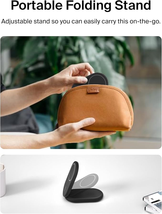 - PORTABLE CHARGER W/ FOLDING STAND: With its foldable design, this portable charger lets you easily set up shop and adjust your angle anywhere you go β get a quality charge whether you're at home, at work, or the hotel of your next vacation.