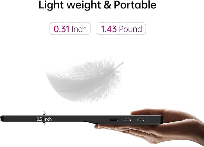 - Portable & Light Weight - At just 1.43lbs and 0.31 inch thin, this portable laptop monitor is ultra-portable and perfect for on-the-go productivity or gaming. flexible to use anywhere you need a second screen for laptop. bringing you efficiency for meetings, work from home, and presentations.