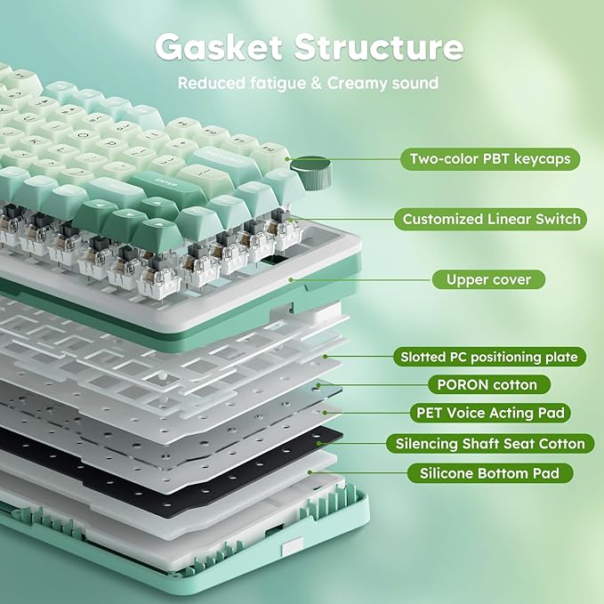 - 【Gasket Structure & PCBA Single Key Slotting】K681 Cream keyboard adopts a gasket structure, combining flexibility and stability while using PCB single-key slotting to better optimize the rebound and stability, feel more comfortable and soft elastic, and increase Poron and silicone padding-bottom cotton between PCB and positioning board to reduce the noise of knocking and sound more pure