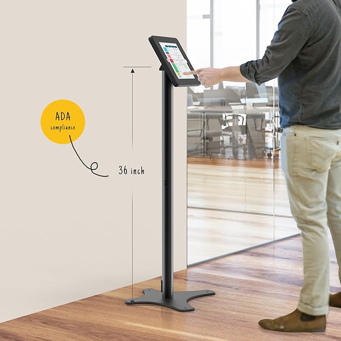 - ➤ 【Space Saving. Support ADA.】This tablet floor stand is slim, fit in most situations. It's made of two kinds of meterial, Metal iPad Enclosure+Aluminum Pole+Metal Base. The thickness of bottom panel is high to 6mm, durable and steady. The height is 39 inches supports ADA compliance.