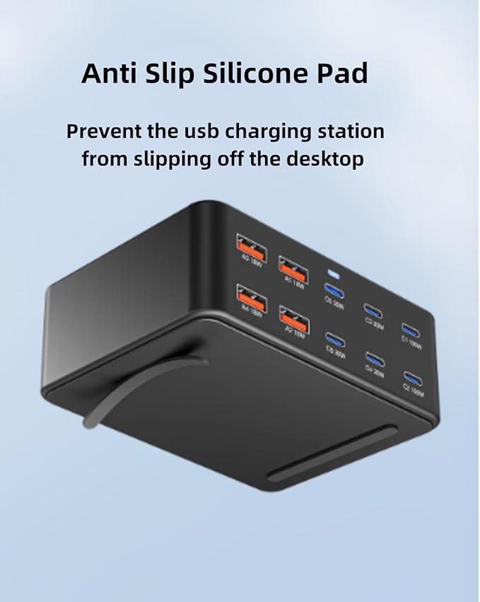 - 10 Devices Charging Simultaneously:This multiple USB charging station features 6-USB C fast charging and 4-USB A high-speed charging, When charging USB C1/C2single port, the maximum power is 100W,when the 10 ports are charged simulataneously,Intelligent current distribution, USB C1 with a maximum current of 65W, USB C2 with a maximum current of 45W,other 8 ports with a total output of 40w,which can quickly charge devices such as iPhone, tablets, mac book, etc. Simultaneously
