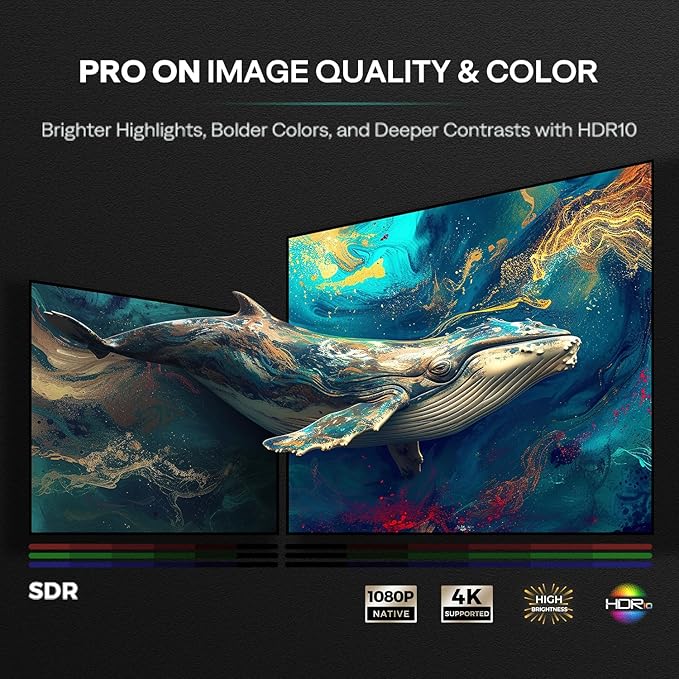 - Pro on Clarity: Native 1080p & HDR 10 & 4K Supported. Enjoy stunningly clear and lifelike visuals with the It’s native 1080p resolution, bringing every detail to life whether you’re watching a movie, gaming, or streaming your favorite content. Connect 4K devices via HD Cable to experience ultra-HD content (*projected at 1080p for seamless compatibility). The inclusion of HDR10 enhances contrast and color accuracy, delivering deeper blacks and more vibrant colors for a truly immersive experience. Perfect for home theaters, gaming setups, or outdoor movie nights.