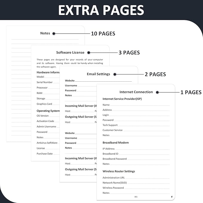 - Plenty of Space - The A5 password book has an amazing 624 entry spaces to record website login details. Each entry has a wide line spacing of 8mm and is combined with a large font. What's more, it adds extra pages for INTERNET CONNECTION (1 page), EMAIL SETTINGS (2 pages), SOFTWARE LICENSE (3 pages), and NOTES (10 pages).