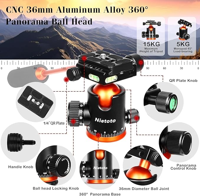 - 【36mm CNC Metal Ball Head】The tripod head is fully CNC machine-processed and equipped with a 36mm large ball head. Its precision and durability are better than ordinary ball heads, Two independent pan/tilt control knobs make operation very simple, You can fast rotating the ball head to obtain 360°panoramic shooting angle, The accurate 360°scale with three Level bubble meter allow for precise image alignment. When used as a tray tripod stand, it can provide stronger locking force.