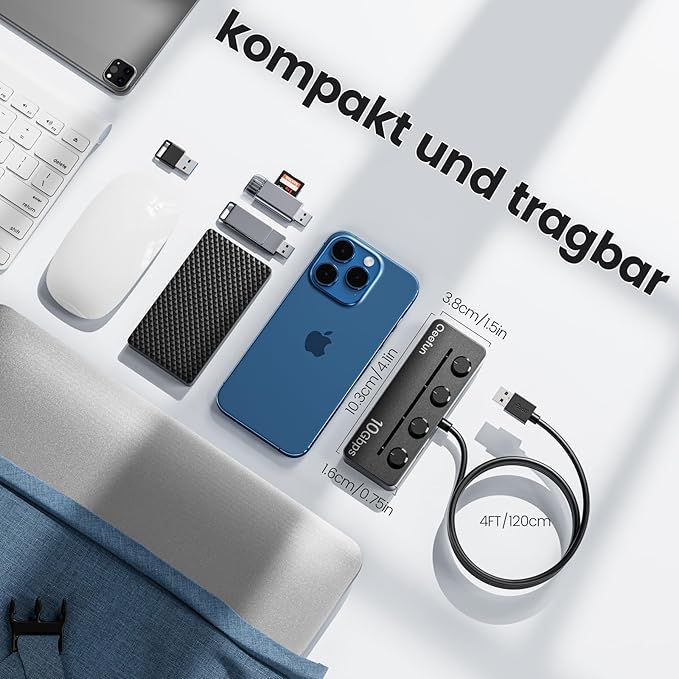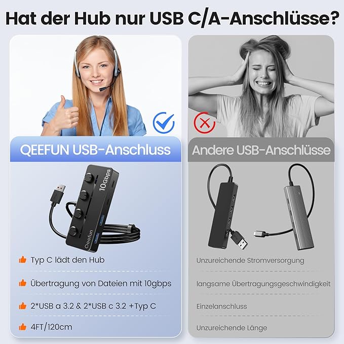 Qeefun 4-Port USB 3.2 Hub with 2 USB-C and 2 USB-A Ports, Individual LED Power Switches,10Gbps Data Transfer USB Splitter with 4ft Extension Cable, Multiple USB Extender for Laptop, PC, iMac etc