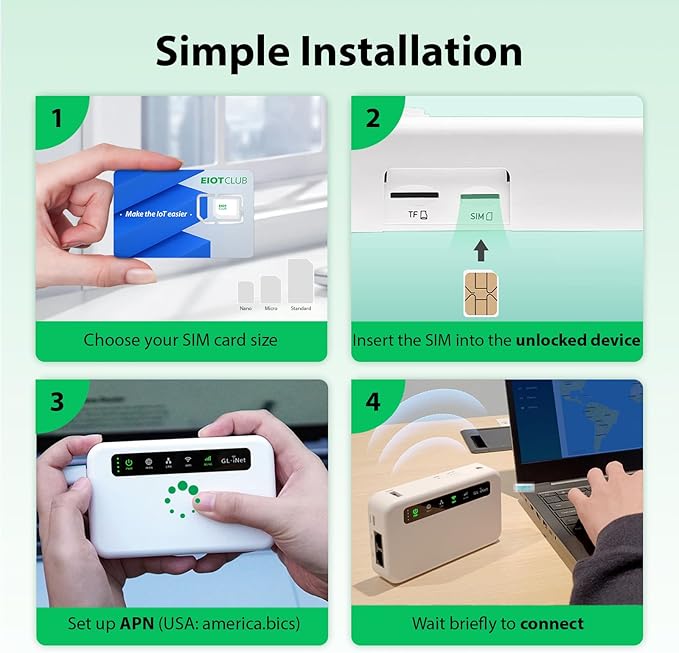 - Wide Device Compatibility - Prepaid SIM cards support a wide range of unlocked IoT devices, including 4G LTE security cameras, trail cameras, WiFi hotspots, 5G/4G routers, and GPS trackers. USA APN: "america.bics"