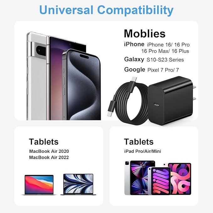 - [Fast charge iphone 17/16/15] This fast charging sets included 2 Pack 20W PD wall chargers and 2 Pack iPhone fast charging cables,which can be used separately.Compatible with iPhone 17/17 Air/17 Pro/17 Pro Max/16/16 Pro/16 Pro Max/16 Plus/15/15 Plus/15 Pro/15 Pro Max, iPad Pro 12.9 inch 6th/ 5th/4th/ 3rd, iPad Pro 11 inch 4th/ 3rd/ 2nd/ 1st, iPad Air 5/4th, iPad Mini 6th, iPad 10th Generation; MacBook Air M1 M2;and other USB-C enabled devices