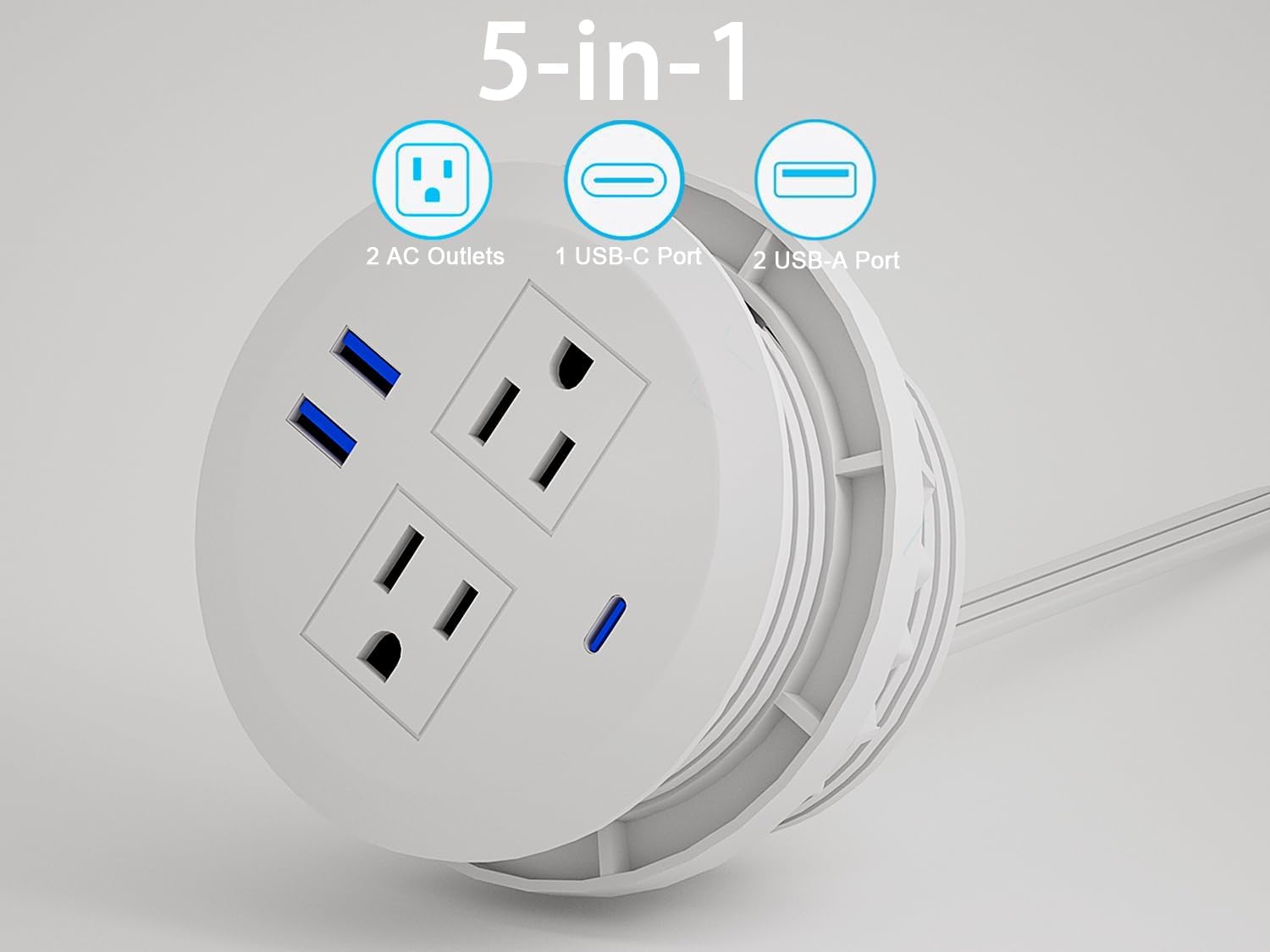 - All-in-One Recessed Power Outlet - 2 AC outlets,2 USB-A ports,and 1 USB-C port power everything on your desk from a single recessed power grommet,6.56 ft extension cord