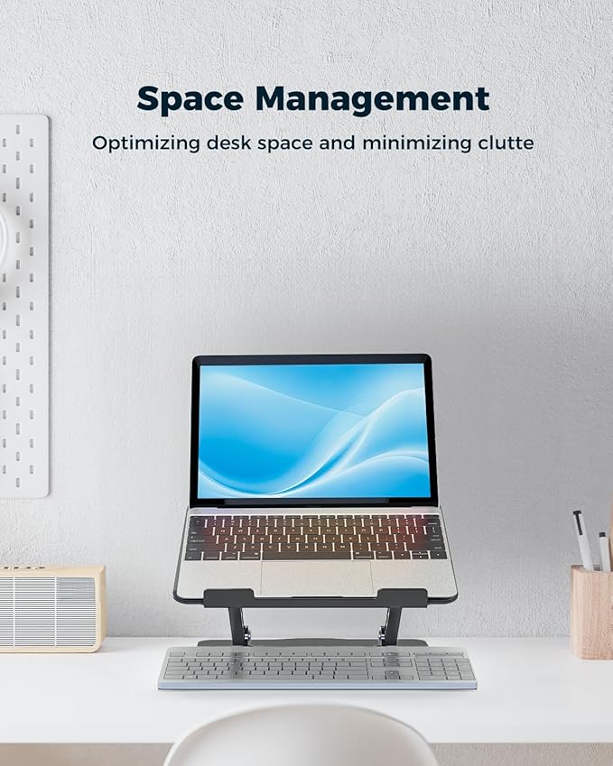 - Ergonomic Laptop Stand for Desk: The adjustable height and viewing angle elevate your laptop screen by 10.6’’ to a comfortable eye level - promotes better posture and reduces neck and back strain from hunching over your laptop. The laptop riser for desk accommodates most people’s ergonomic needs, even taller users. The 360° rotating base helps you easily share your screen with colleagues without moving the stand, perfect for virtual meetings or group projects