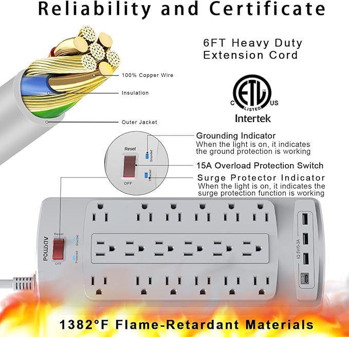 - Safety and Certificate: ETL safety certified, with extension cord and other major components certified by UL. The over current protection switch limits the power strip's working current to certain setting, so it will not get hot during usage. Environmental protection and fire-resistance PC shell with flame retardant at 1382โ makes it more durable and longer lifetime.
