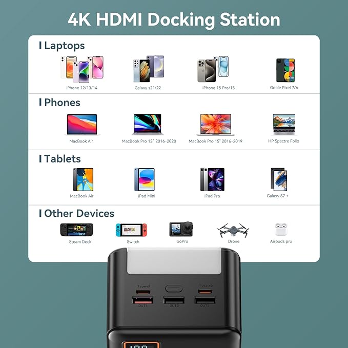 - Broad Compatibility:This LED Display 72000mAh Power Bank is not only suitable for all mobile phones, tablets, most laptops, drone etc, but also for your low-current devices such as AirPods, bluetooth headphones, smart watches etc