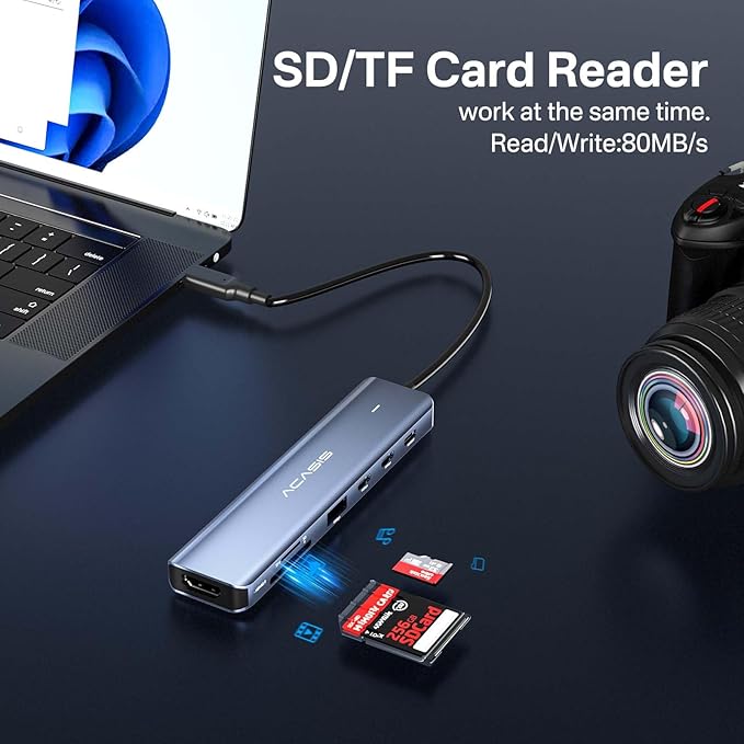 - [ACASIS 7-in-1 Docking Station ]This usb c hub splitter for laptop provides a variety of interfaces, including 2 USB C 3.1 10Gbps ports, 1 USB A 3.1 10Gbps port, 1 usb c to HDMI 4K@60HZ port, 1 SD card reader usb slot and 1 TF card slot, and 1 PD 100W charging port,This is powered usb c hub, which greatly improves your work efficiency.