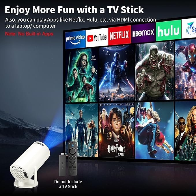 - 【Warm Tips】Due to HDCP agreement, screen mirroring doesn't work (no image or sound) when you try to mirror the content from some apps (Prime Video, Hulu, etc.), Please play these videos by inserting a TV Stick/Roku/Chrome-cast into the projector or to connect to a laptop/computer via HDMI Connection