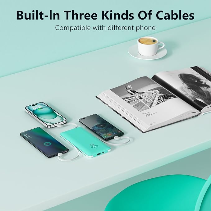 - [6 in 1 Portable Charger with Built-in Cable ]:Built-in 3 cables for different types of cell phone directly,no need take other charging cable,built-in AC wall plug fast charge,so when you outside ,only take this portable charger is OK ,no need other cables and adapter.