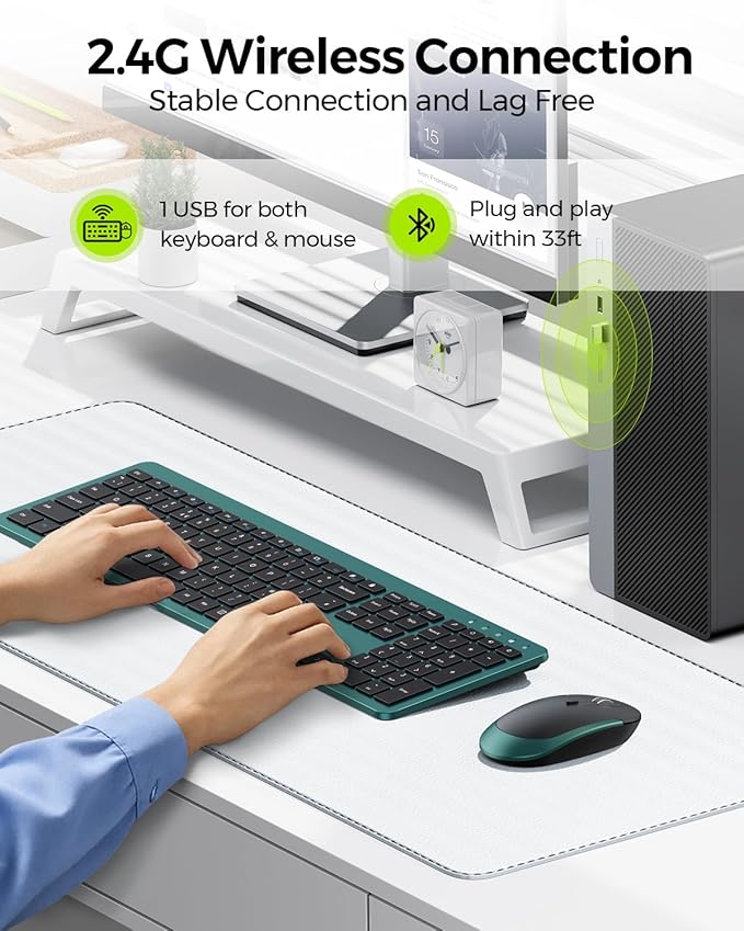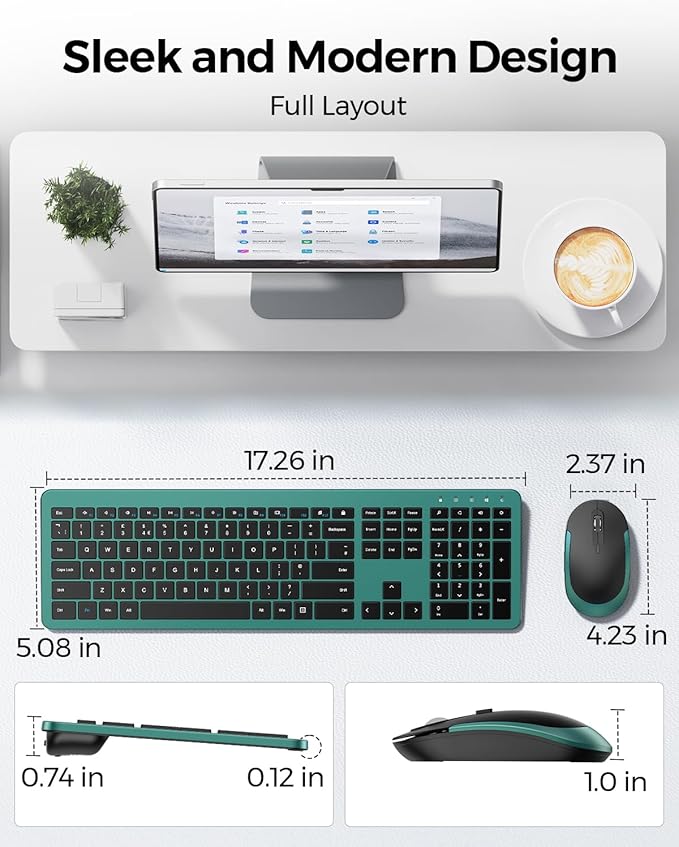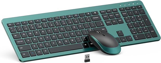 Wireless Keyboard and Mouse Combo - Full Size Slim Thin Wireless Keyboard Mouse with Numeric Keypad 2.4G Stable Connection Adjustable DPI (Dark Green)