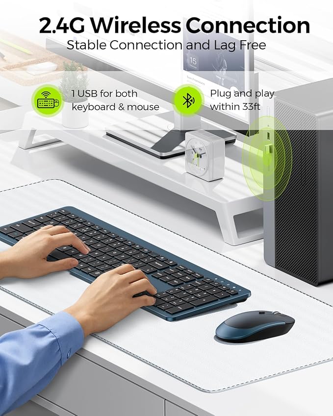 - 1 USB Plug for Both Keyboard and Mouse -- This keyboard & mouse combo using only 1 USB plug, which is inserted on the back of the Mouse. Stable 2.4GHz wireless provides a powerful, reliable connection up to 33ft without any lags
