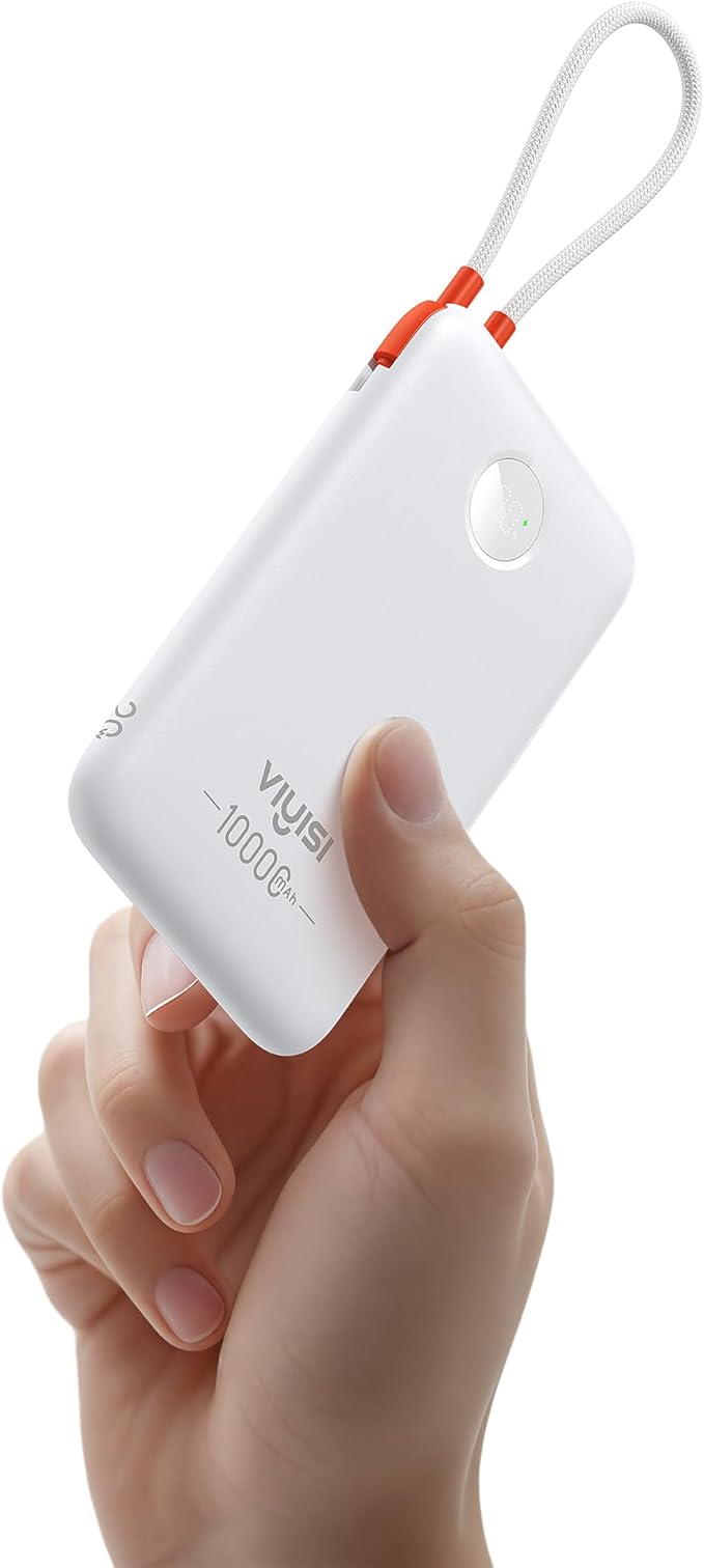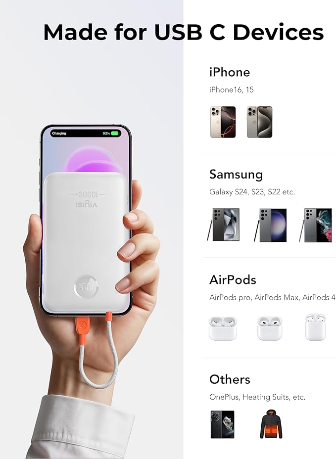 - Built-In USB-C Cable: Designed specifically for USB-C devices, this small power bank perfectly compatible with iPhone 16/15 series, Samsung Galaxy, Google Pixel and other Type-C devices, always ready without a separate cable!