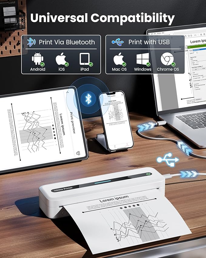 - EASY TO USE: Setting up and using our bluetooth printer is a breeze. Simply connect it to your phone, tablet via bluetooth, and start printing in 1 min. For Laptop or computers, plug in the USB. Compatible with Windows 10/11, Mac, Linux. 1 The user-friendly interface and intuitive controls make printing a hassle-free experience. Get ready to unleash your printing potential with this user-friendly and portable printer.