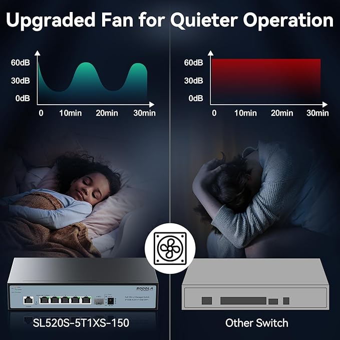 - 【Noise Reduction】Engineered with an upgraded cooling fan, this 10g managed switch addresses the common issue of high-power switches being noisy. The fan intelligently adjusts its speed based on power consumption and heat, ensuring near-silent operation during idle times. It's an ideal choice for 10g switch installations in home environments.