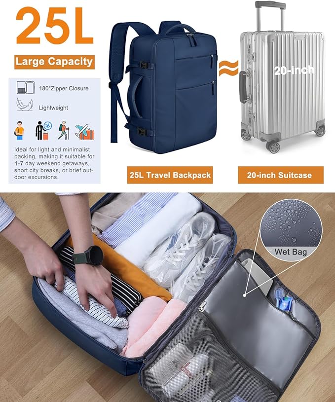- Comfortable Carry On Backpack:Featuring a breathable mesh back panel and padded shoulder straps designed to effectively alleviate pressure on your shoulders and neck. 13.5*7.5*18.5 inch comply with the majority of airline regulations for carry on bags, ensuring hassle-free travel
