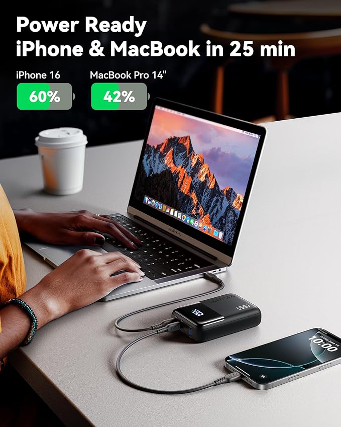 - Power Ready iPhone & MacBook in 25Mins: A must-have for multi-device users, this power bank provides up to 110W high-speed charging for 2 devices at once. In just 25 minutes, it can charge your MacBook Pro 14" to 42% and iPhone 15 to 65%.