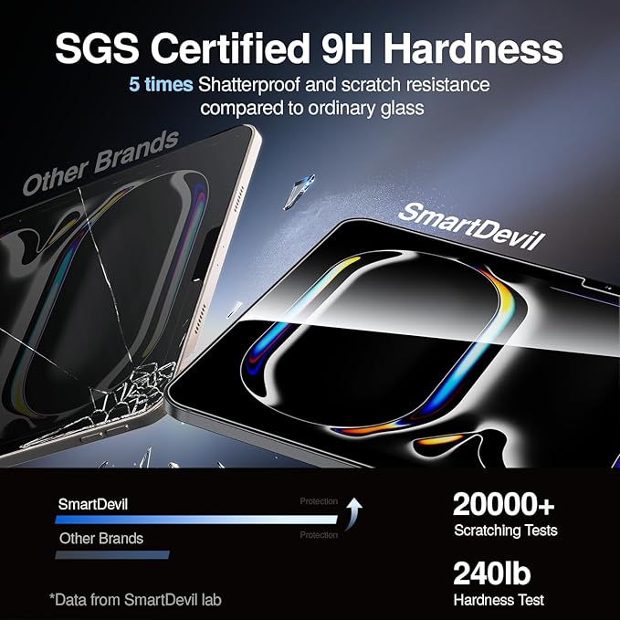 - 【Military Grade Shatterproof】 This tempered glass iPad screen protector film made of nano-sized super-strong shatterproof tempered glass material. SMARTDEVIL Lab has tested thousands of times, even if the edge of the tempered film is squeezed more than 10,000 times, it will not break and scratch. (Certified by SGS) Its hardness has far exceeded the other screen protector on the market.