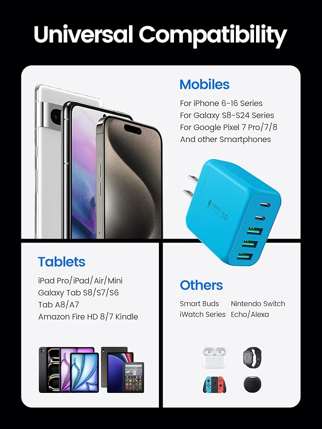 - Works with All Devices:Thanks to its special 5-port design, this USB-C charger plug is compatible with nearly all electronic devices. It works with iPhone models from 7 to the latest iPhone 17, various iPad models, Samsung Galaxy phones including the S24 and Note series, as well as LG, Motorola, Google Pixel, Apple Watch, AirPods, Samsung Watch, Galaxy Buds and many other digital devices.