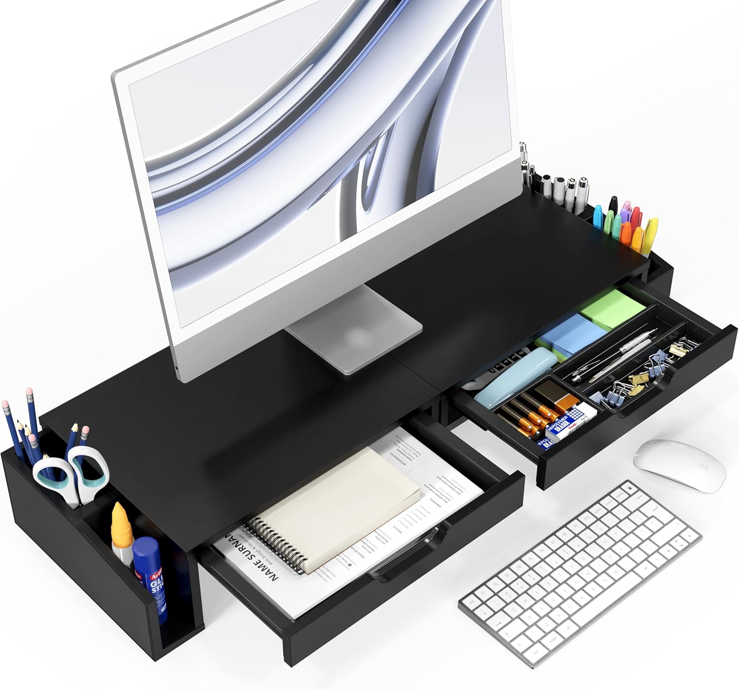 - Pull-Out Drawers - One drawer includes compartments for pens, sticky notes, and small supplies; the other offers open storage for larger items.