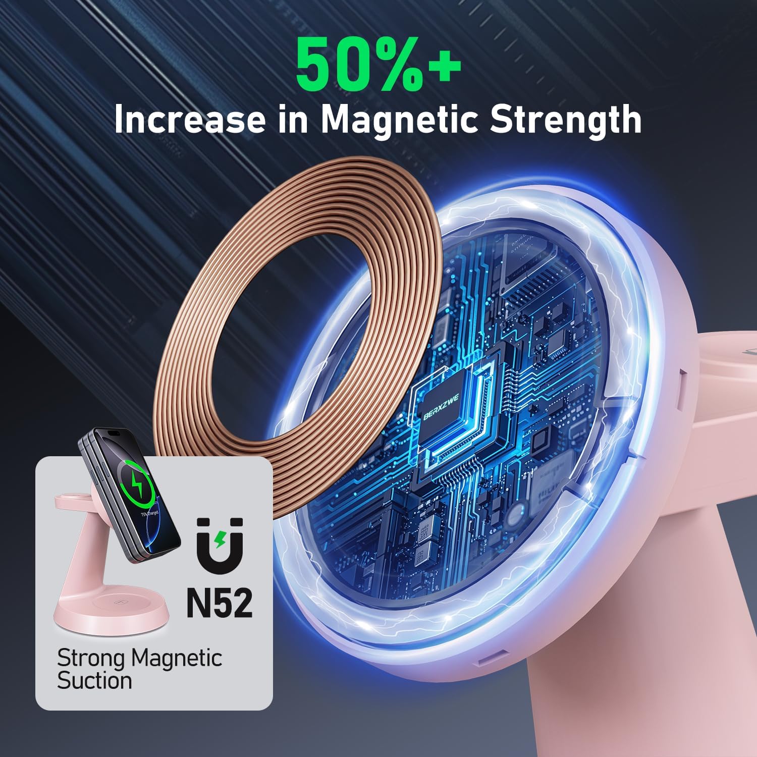 - 3 in 1 Magnetic Wireless Charger Station: BERXZWE 3 in 1 magnetic wireless charger station has newly upgraded magnetic suction. Efficiently wireless charging of iPhones, Apple Watches, and AirPods. The portable charging station means you no longer have to search for multiple chargers or deal with a cluttered desktop.Bring you a fast and stable magnetic wireless charging experience