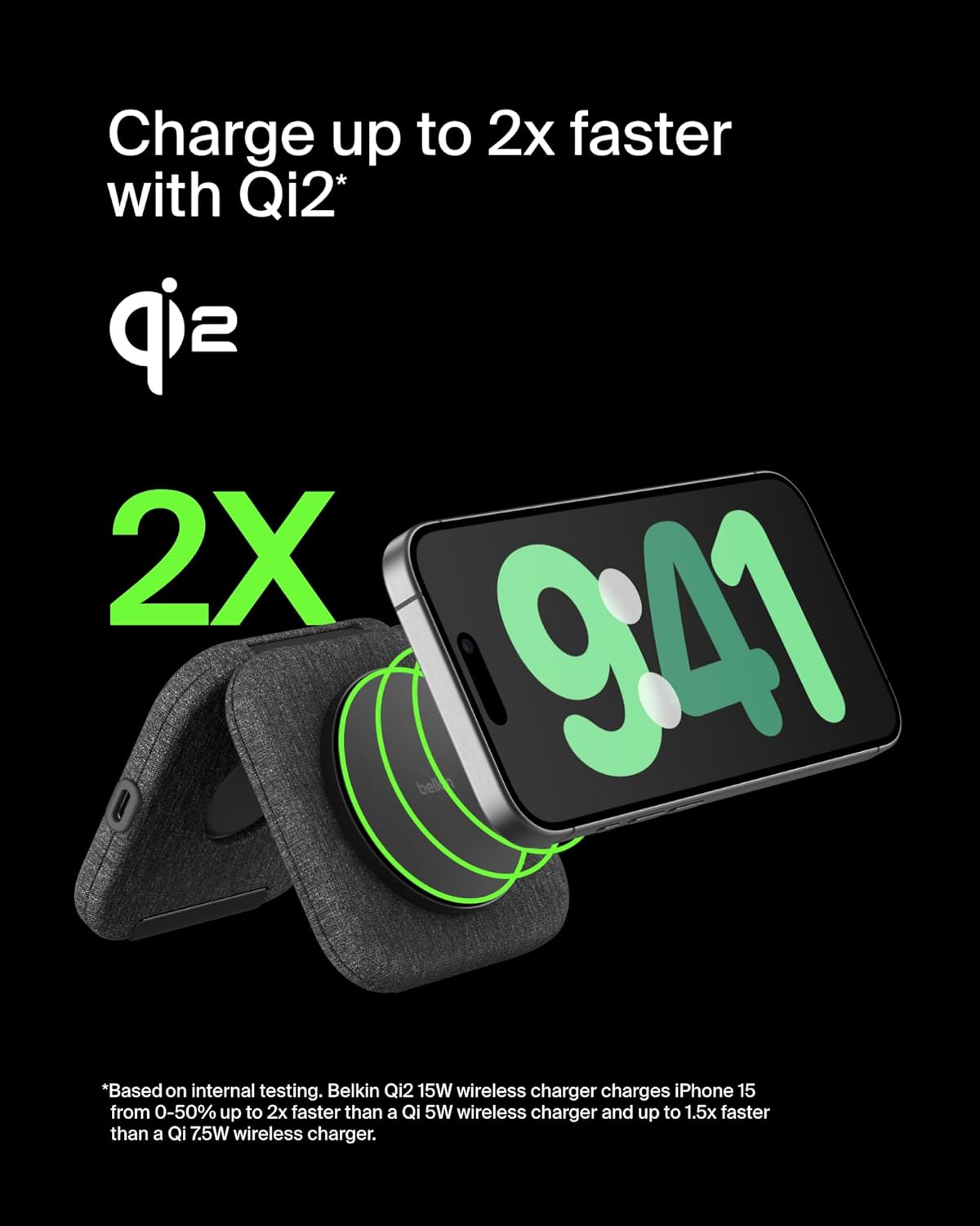 - FAST CHARGE W/ THE LATEST Qi2 TECHNOLOGY: Conveniently place your phone on the magnetic charging pad to fast charge your iPhone or Qi2 compatible device up to 15W. With Qi2, you get up to 2x faster wireless charging so you can spend less time waiting