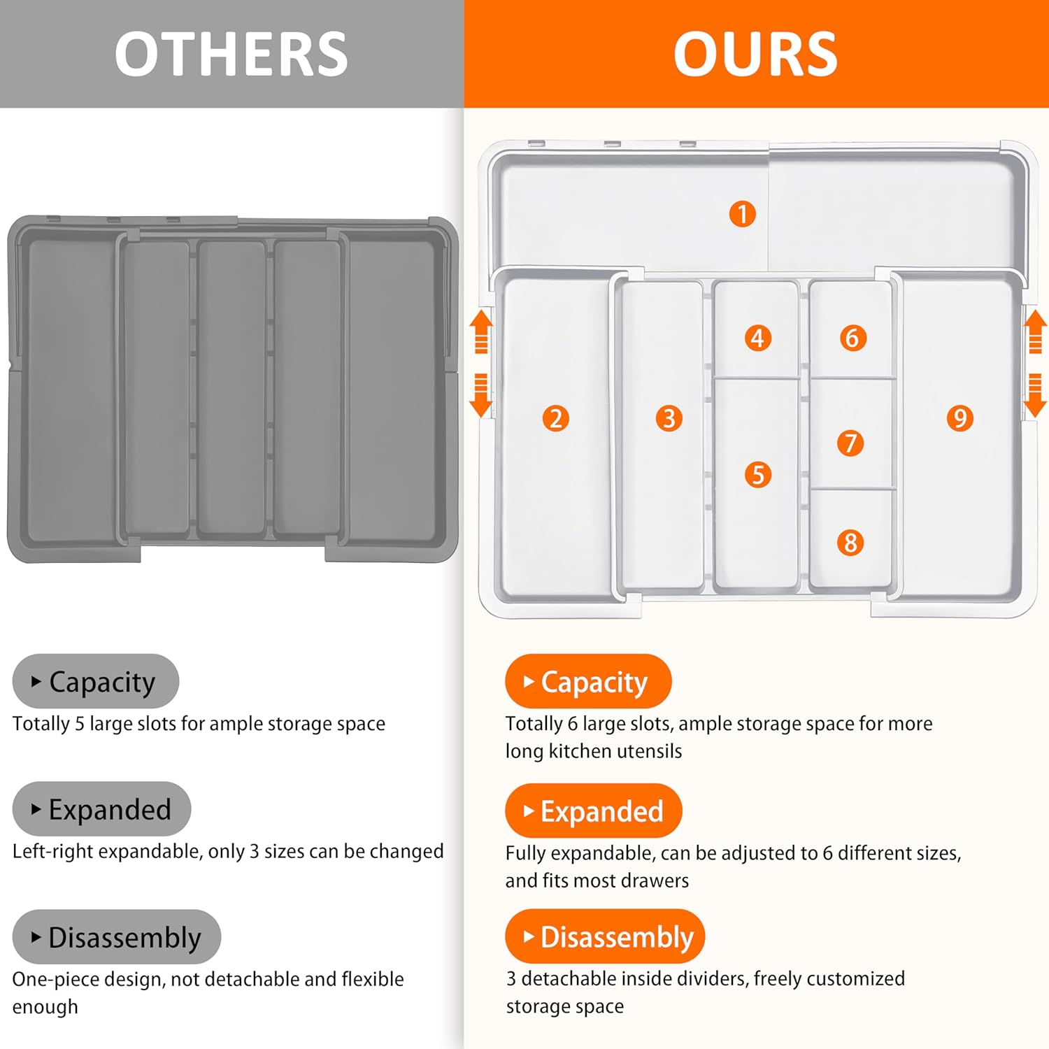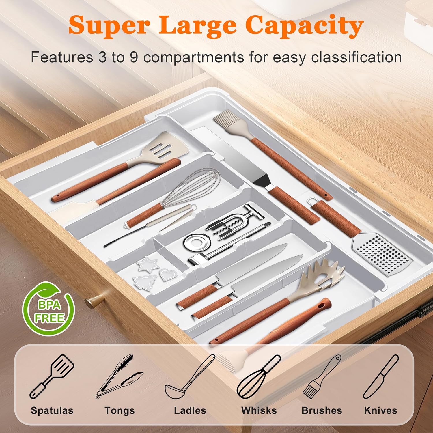 - Super Large Capacity: This silverware tray features 3 compartments in the middle and 3 expandable layers. The expandable compartments are great for storing not just large kitchen cooking utensils such as spatulas, tongs and ladles, but also small flatware and silverware, such as forks, spoons and knives. Maximize the storage capacity of your extra-wide kitchen drawers.